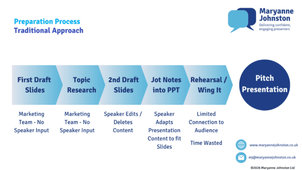 When the presenter isn’t involved early enough, when the audience isn’t clearly defined from the outset, and when slides are built before the narrative is settled, preparation becomes inefficient and unnecessarily stressful.